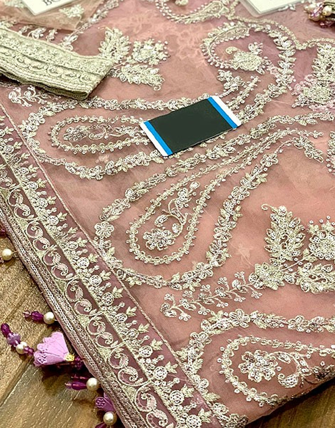 - Heavy Embroidered Net Sleeves with Hanging Tassels