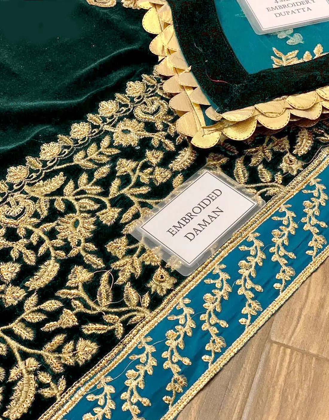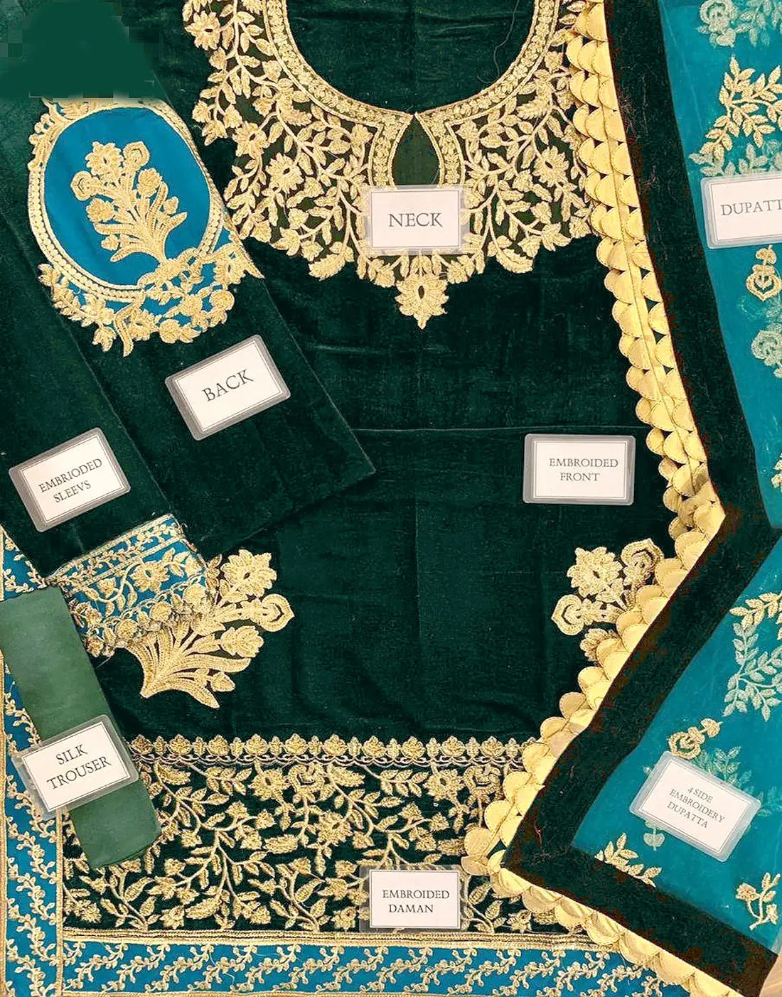 DressyZone.com offers best Luxury Embroidered Bottle Green Velvet Dress (DZ18638) price in Pakistan with fast shipping countrywide. Buy Luxury Embroidered Bottle Green Velvet Dress (DZ18638) online and pay cash at the time of order delivery with Free Shipping on all orders over Rs.10,000 in all major cities of Pakistan including Karachi, Lahore, Islamabad, Rawalpindi, Faisalabad, Sialkot, Hyderabad, Peshawar, Quetta and more.