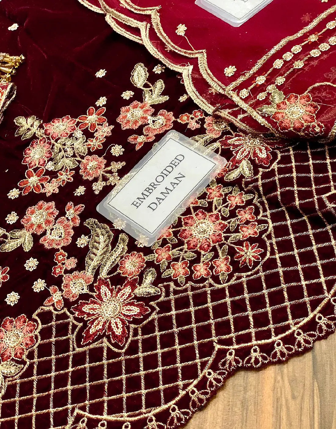 DressyZone.com offers best Luxury Embroidered Maroon Velvet Wedding Dress with Heavy Daman Cutwork (DZ18446) price in Pakistan with fast shipping countrywide. Buy Luxury Embroidered Maroon Velvet Wedding Dress with Heavy Daman Cutwork (DZ18446) online and pay cash at the time of order delivery with Free Shipping on all orders over Rs.10,000 in all major cities of Pakistan including Karachi, Lahore, Islamabad, Rawalpindi, Faisalabad, Sialkot, Hyderabad, Peshawar, Quetta and more.