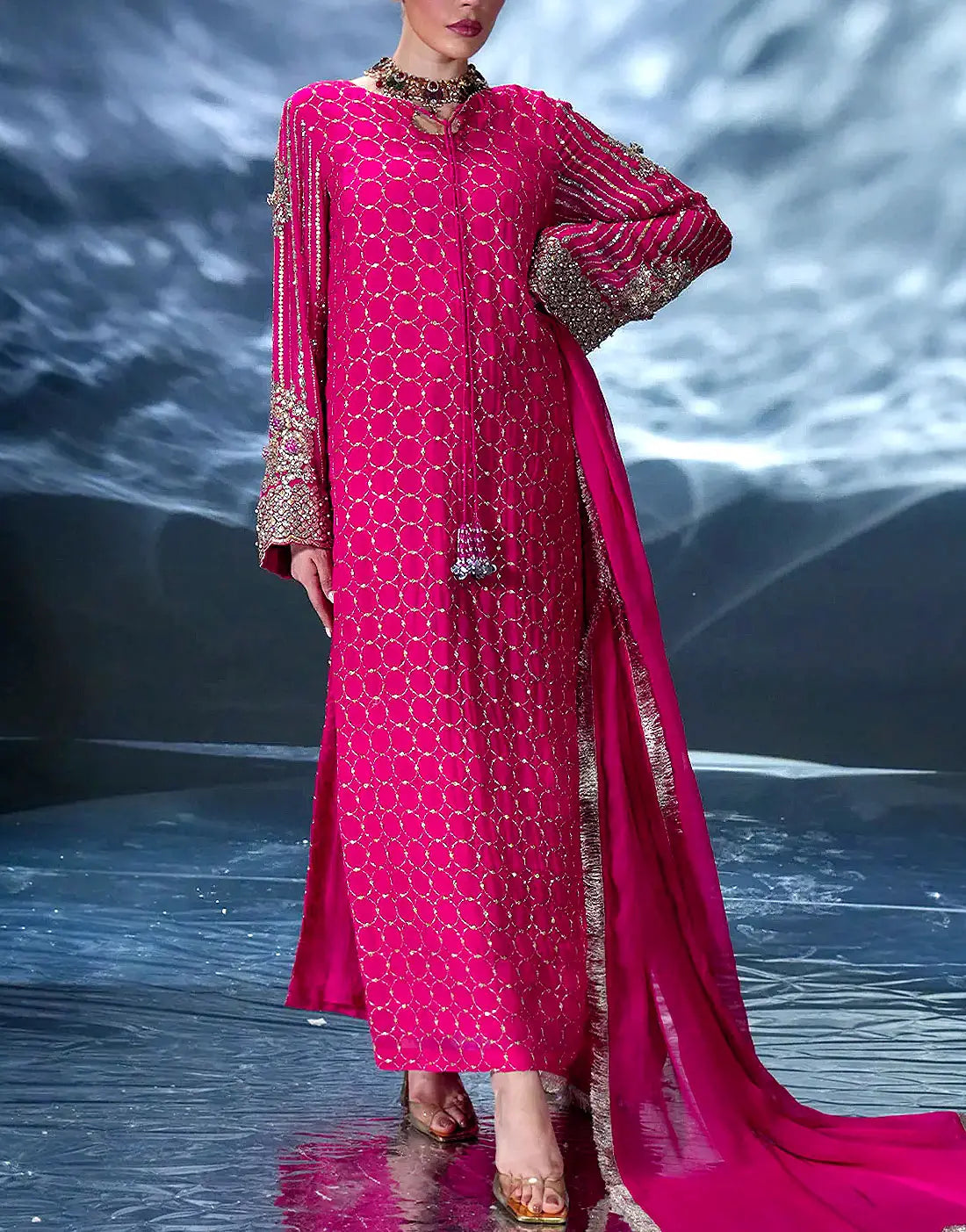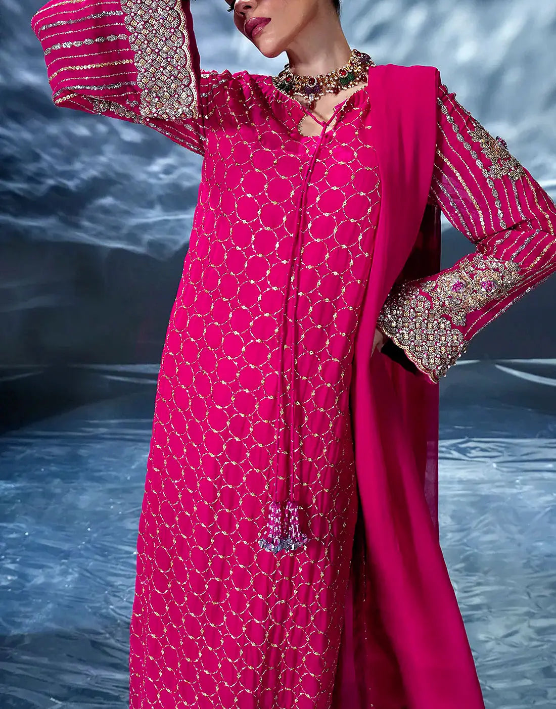 Embroidered Shocking Pink Chiffon Party Wear Dress with Silk Trouser (DZ18615)